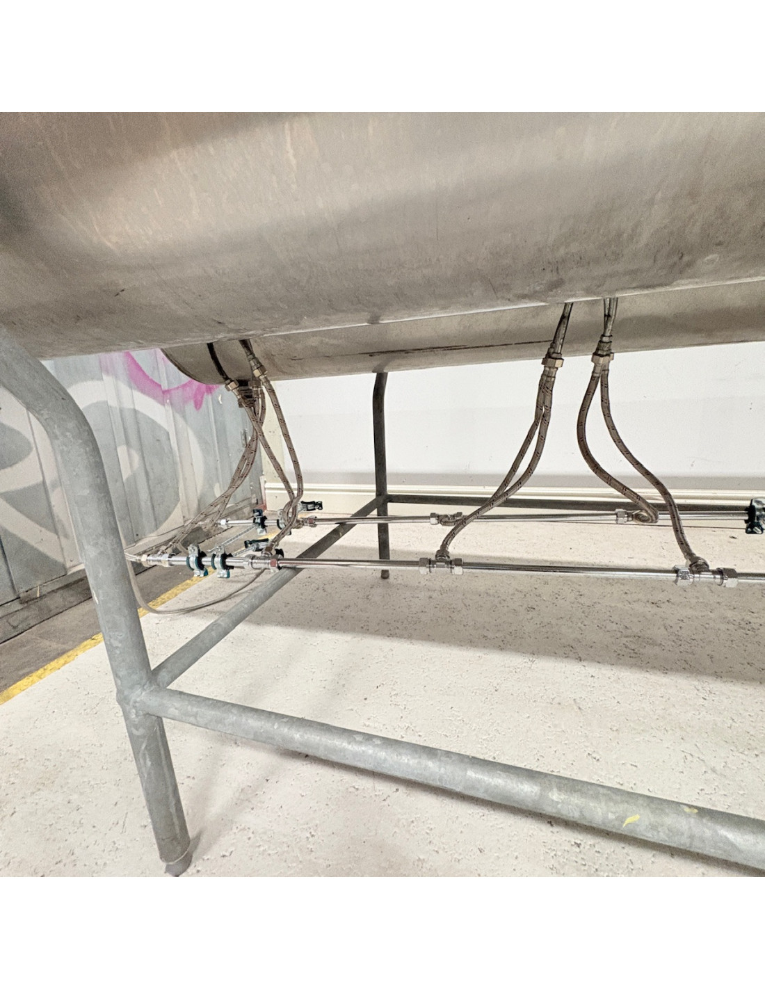 En dubbelsidig tvättränna med 12 stycken blandare. Finns ett färdigt kopplingssystem hängades undertill som smidigt och enkelt bistår med vattentillförsel till alla 12 blandare.
