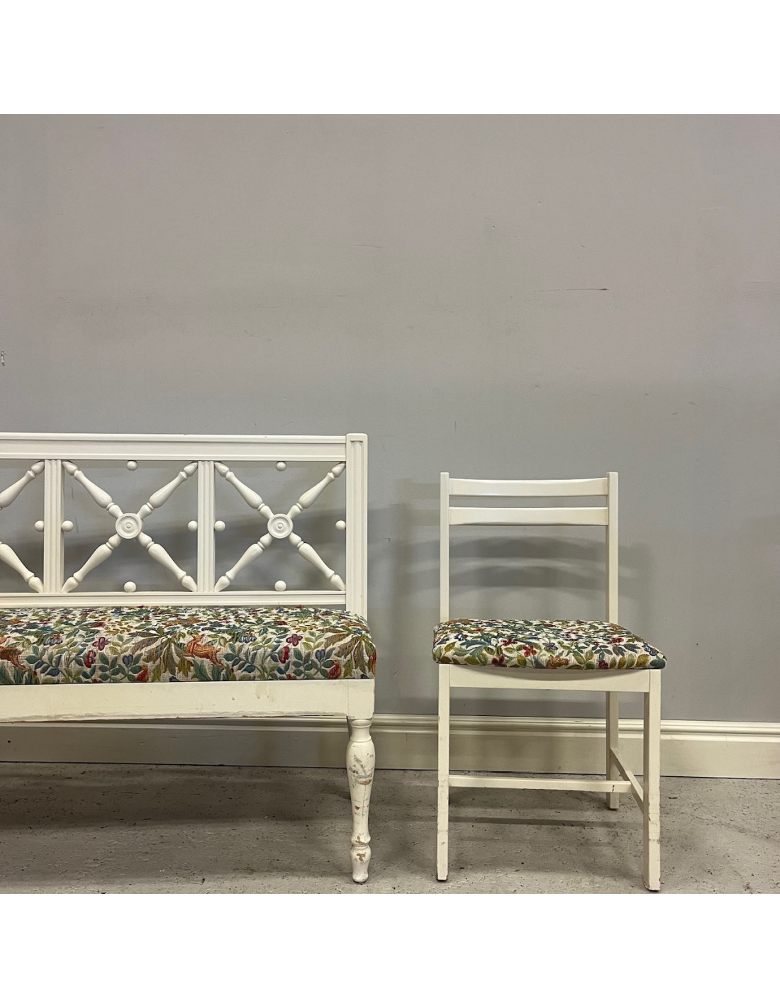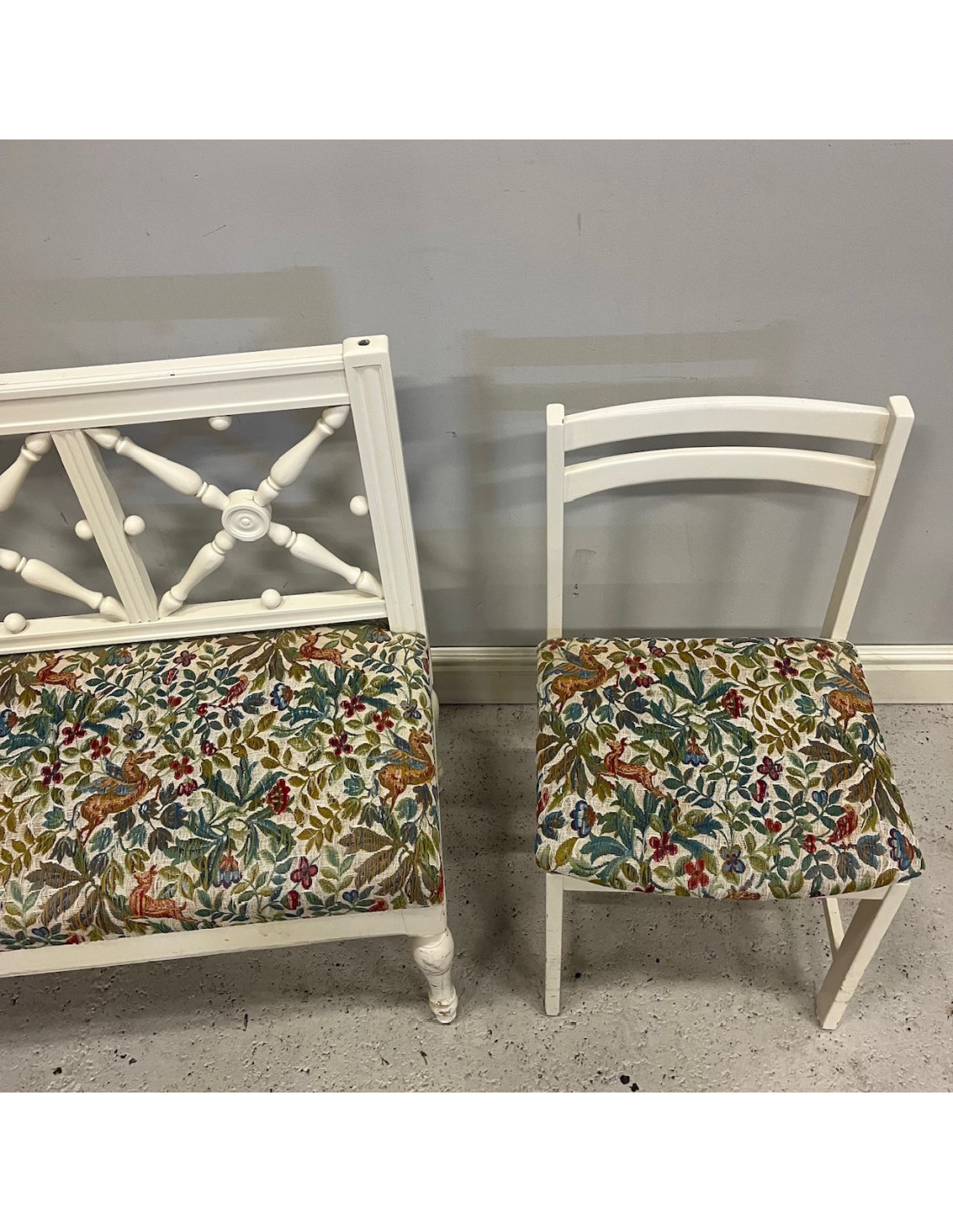 Produkten avser soffan men i butiken finns vid tillfället även en stol med samma klädsel samt en tillhörande bänk med likadana ben men med annan klädsel (klädseln på bänken behöver bytas).