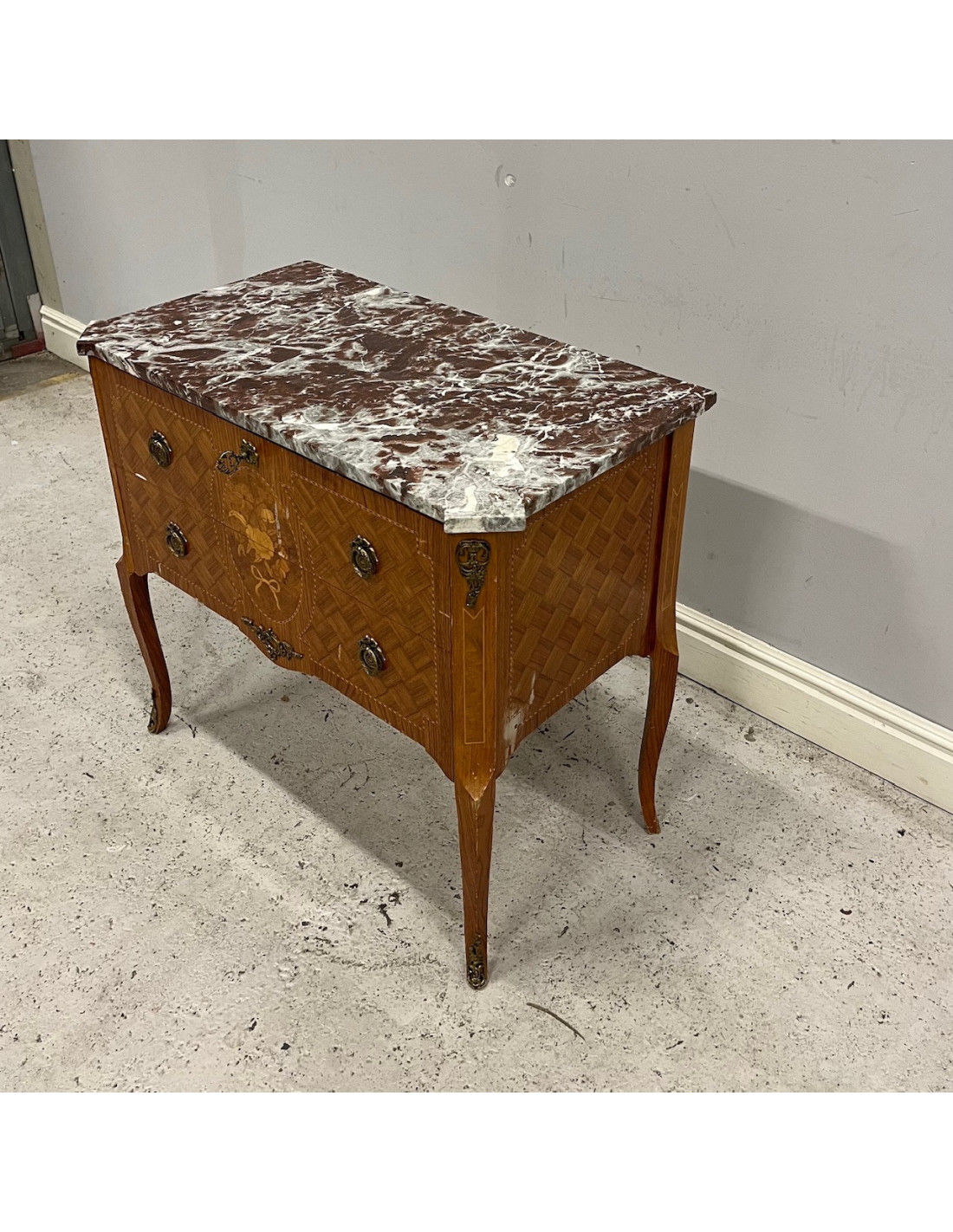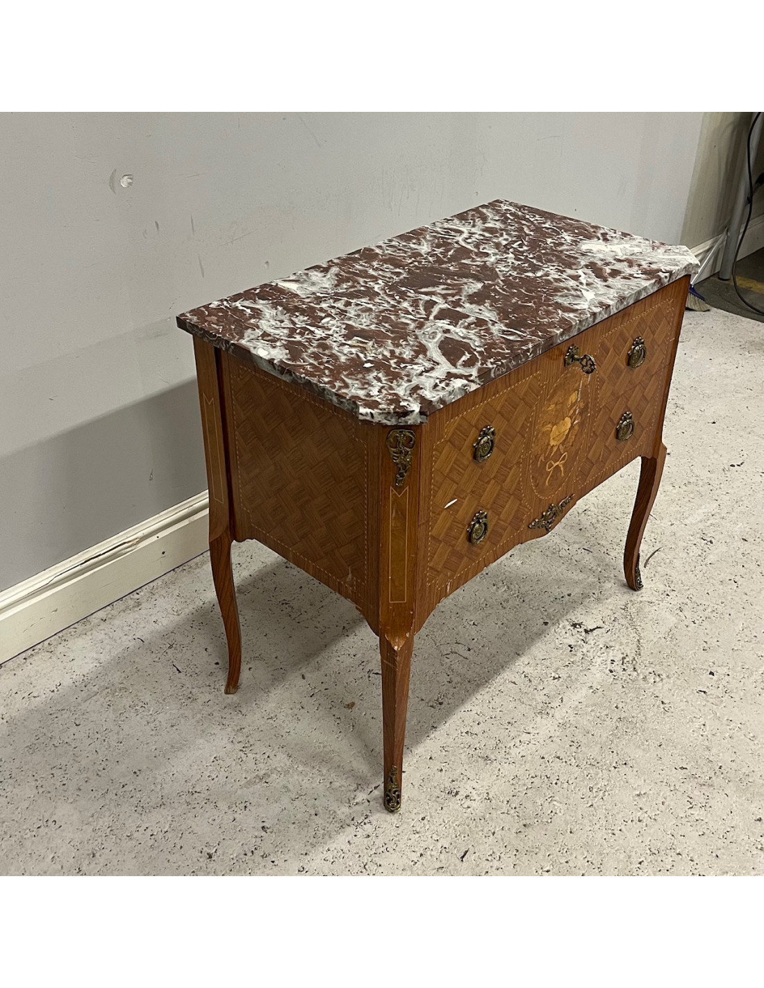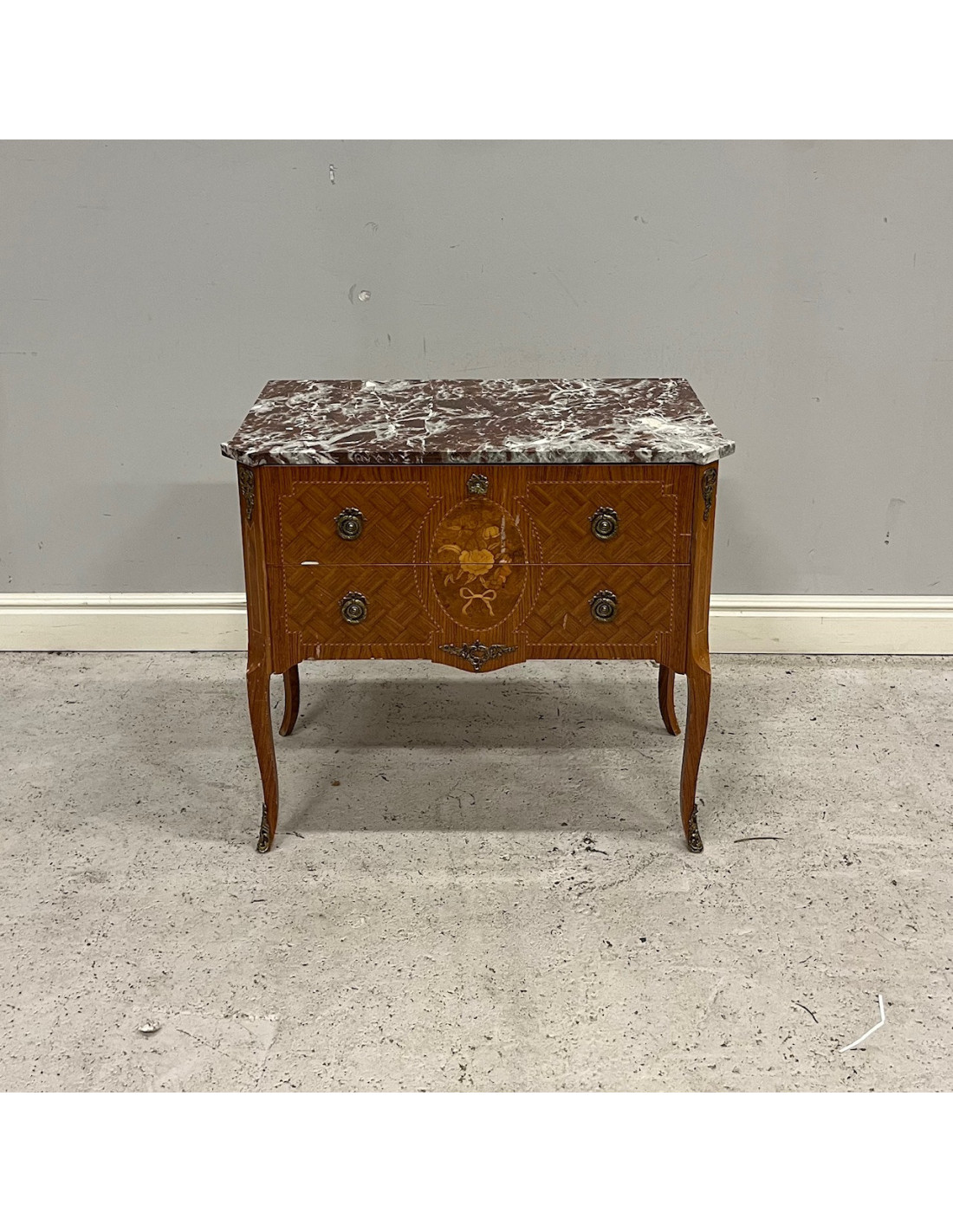 Byrå med två låsbara lådor i gustaviansk stil med intarsiadekor, samt skiva av marmor, 1950/60-tal. Byrån är i bruksskick med visst ytligt slitage, men överlag fortfarande i fint skick.