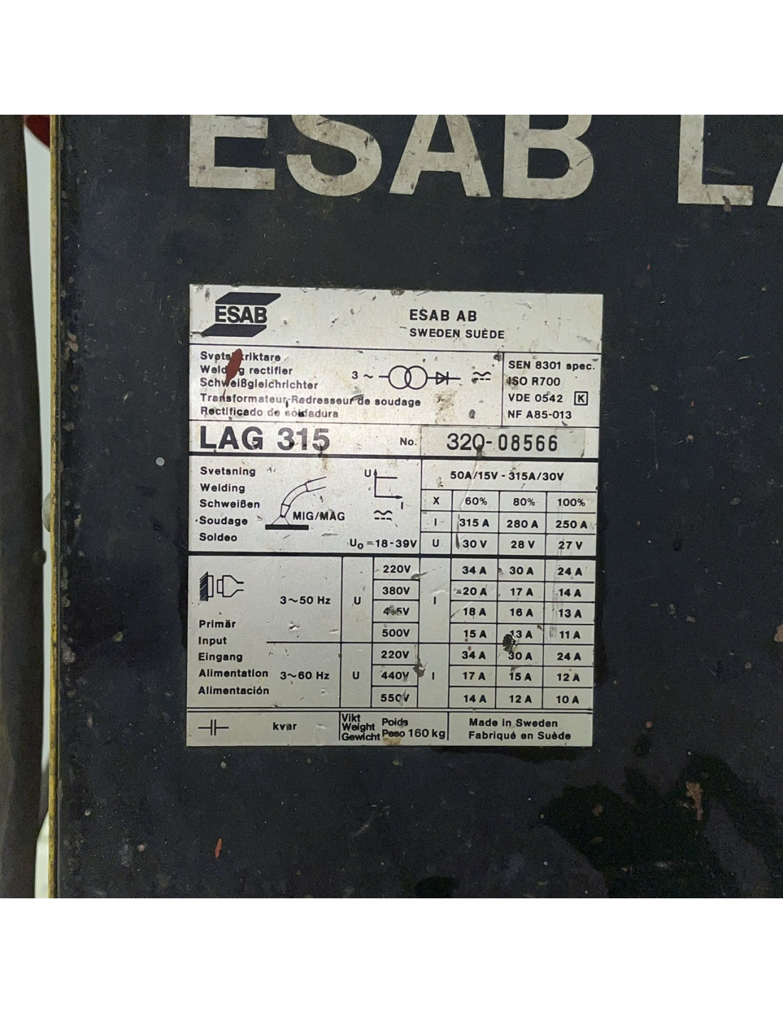 En i bruksskick 3-fas ESAB LAG 315 MIG svets med ett ESAB A10-MEC 30 matarverk. Rullen med svetstråd som syns på bilderna medföljer.